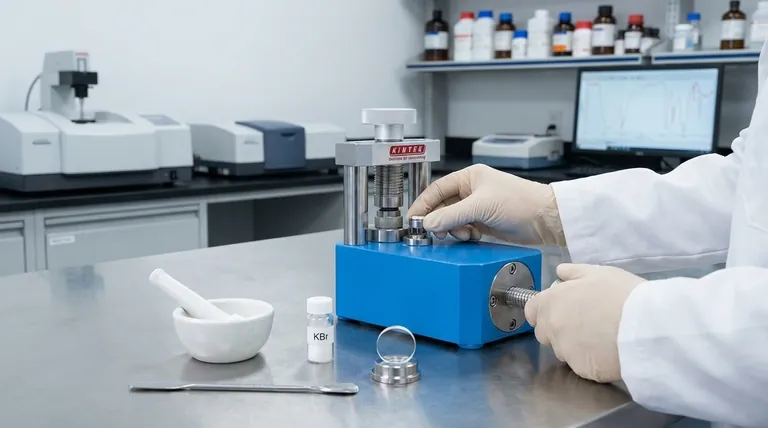 In laboratory FTIR spectroscopy, a hydraulic press is used to create a thin, solid, transparent sample disc from a powder. It does this by applying tons of force to a mixture of your sample and potassium bromide (KBr) powder inside a specialized mold called a pellet die. This process transforms an opaque powder into a glass-like pellet that allows the instrument's infrared beam to pass through for analysis.