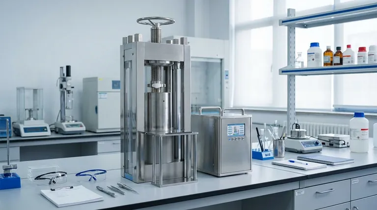 The system includes a dedicated high-pressure pump. This component is responsible for generating the fluid pressure within the vessel, compressing the flexible mold and the powder material inside it.