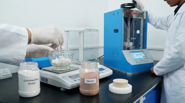 The primary purpose of a binder is to act as a matrix or "glue" for the sample powder. Materials like a cellulose/wax mixture are commonly used for this.